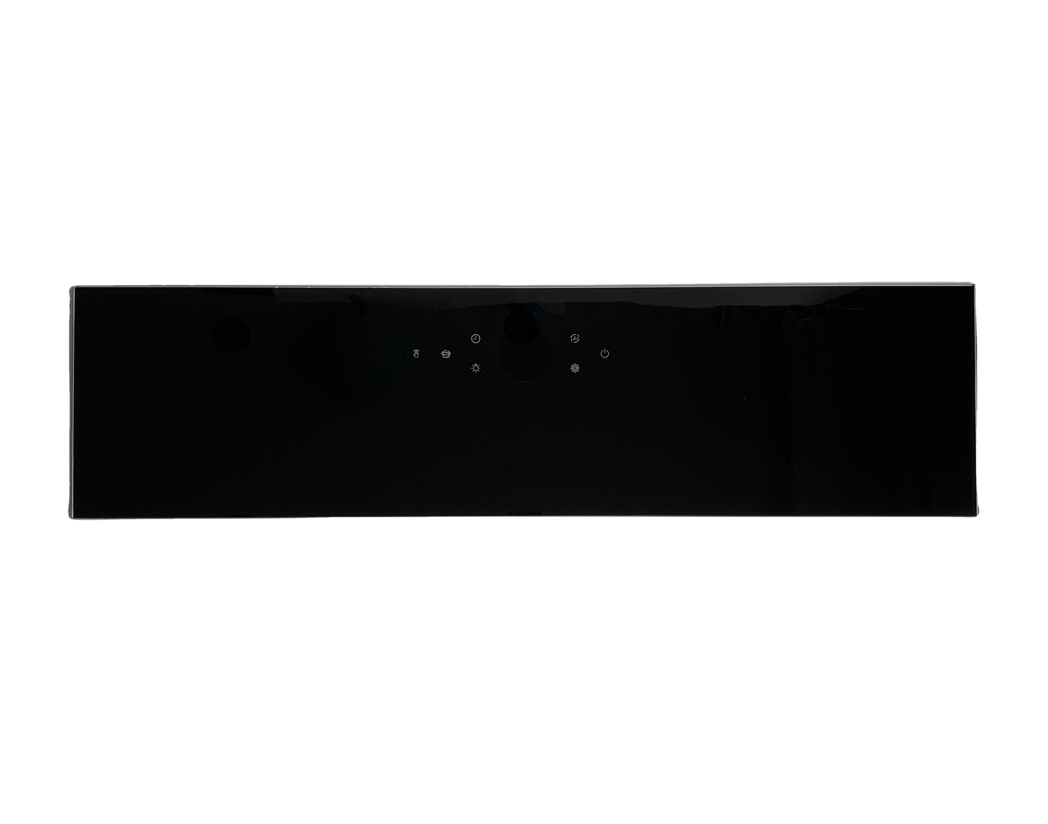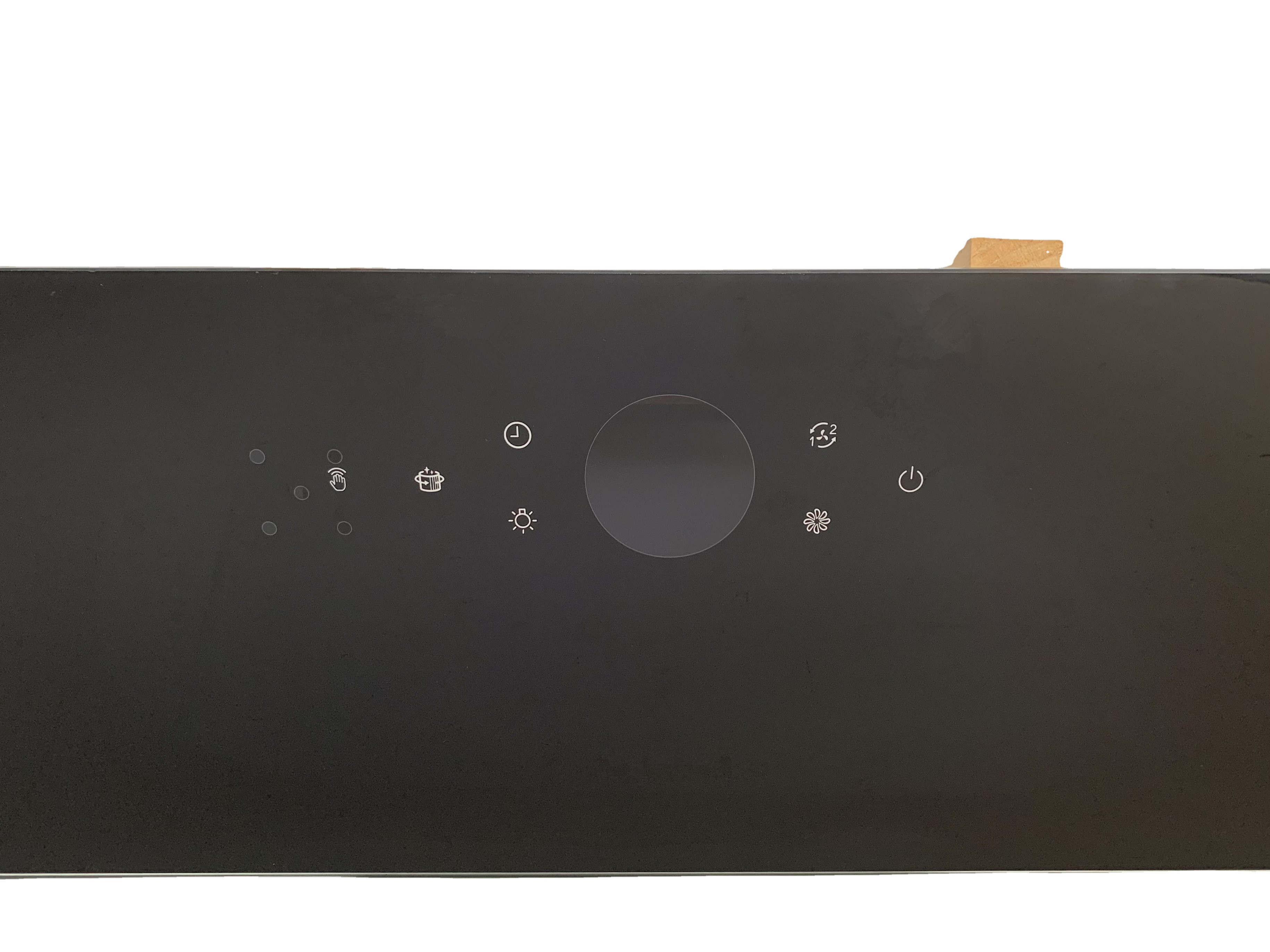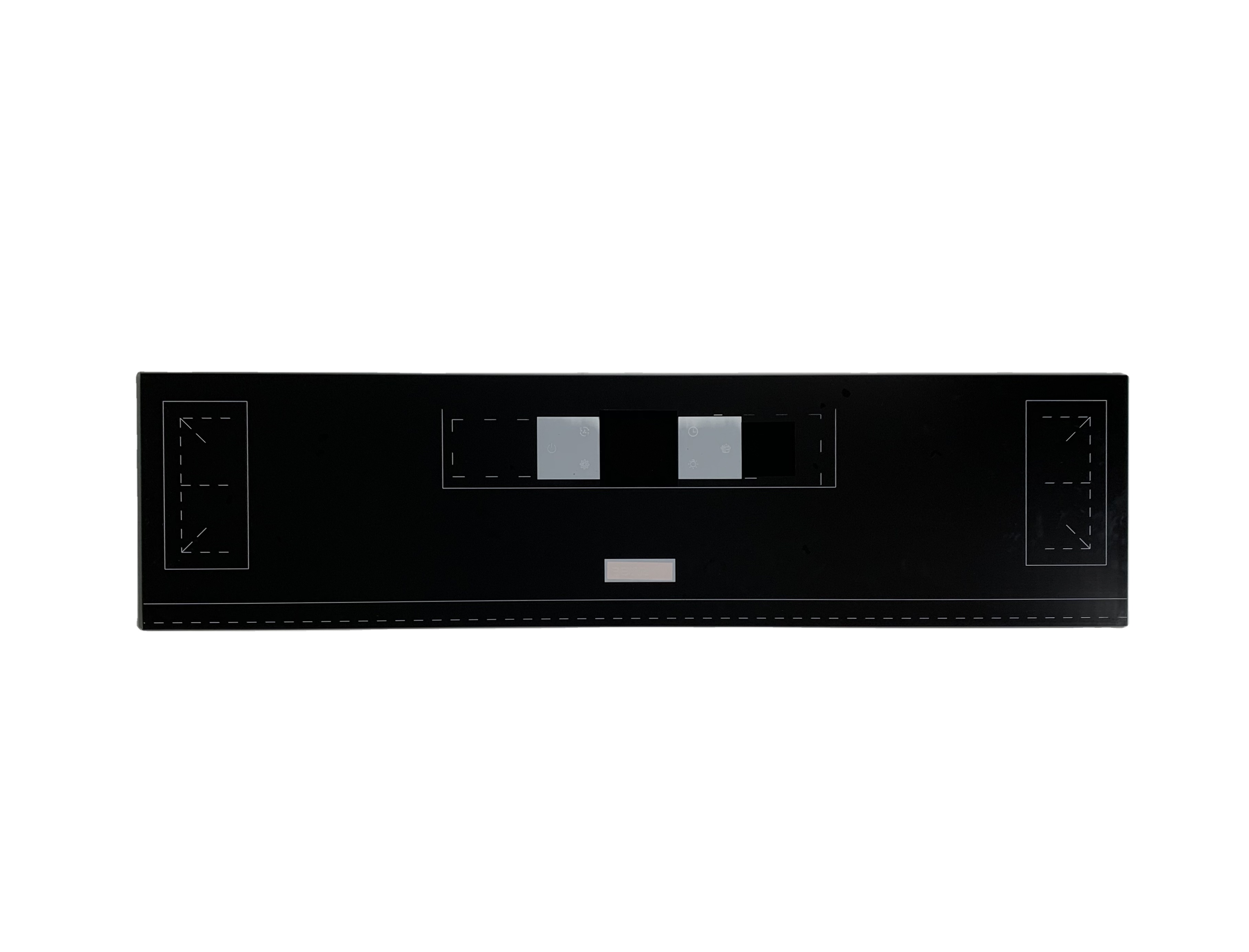 The control panel of this type of range hood is the style of the glass baffle of our new range hood, and its printing includes character printing, multi-color printing, and semi-transparent display printing. And the back positioning line printing for the installation of parts in the whole machine factory. In addition, a translucent window film is attached to the back of the panel to match the hiding effect of characters in the sensing area of the touch screen.