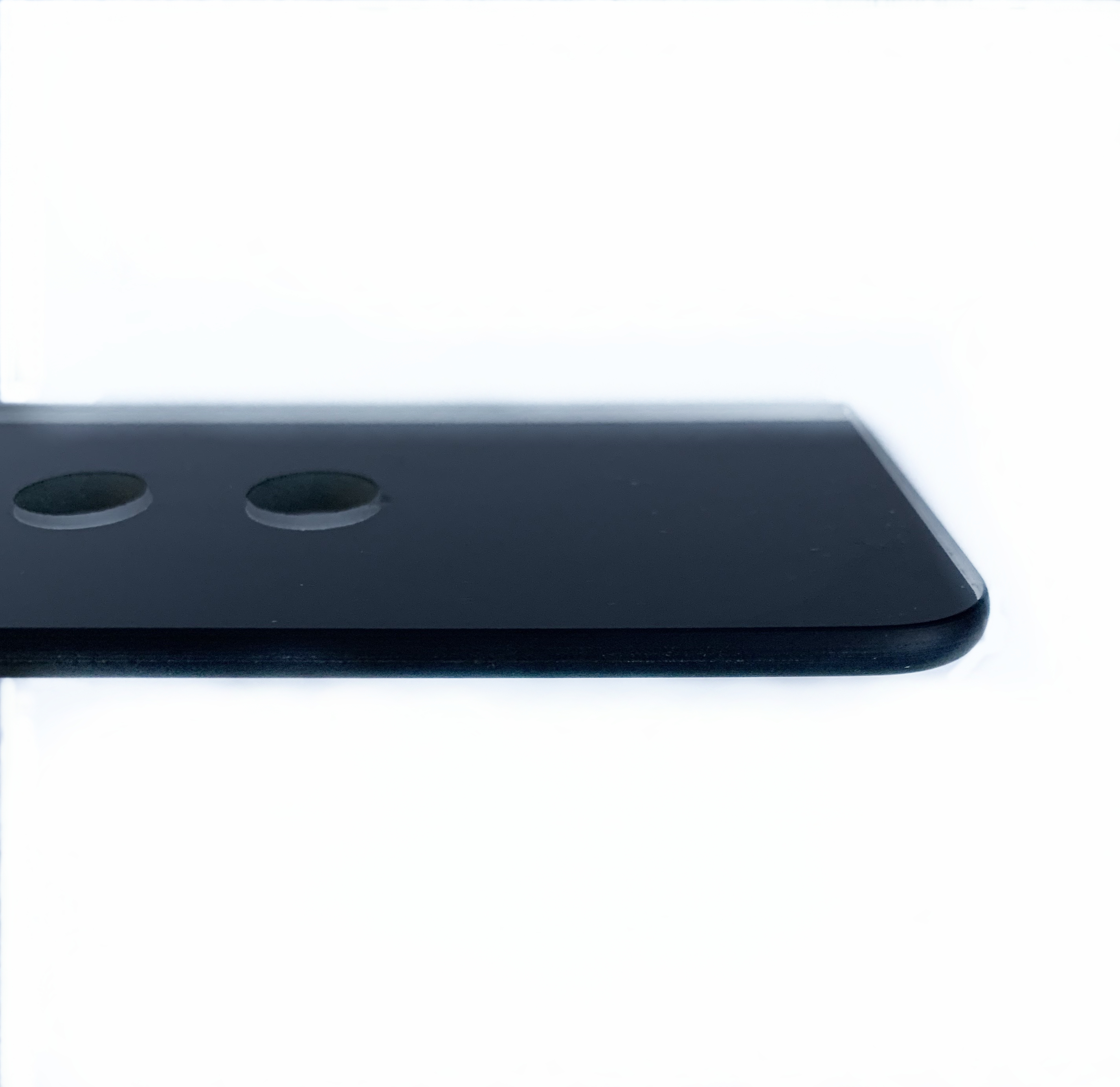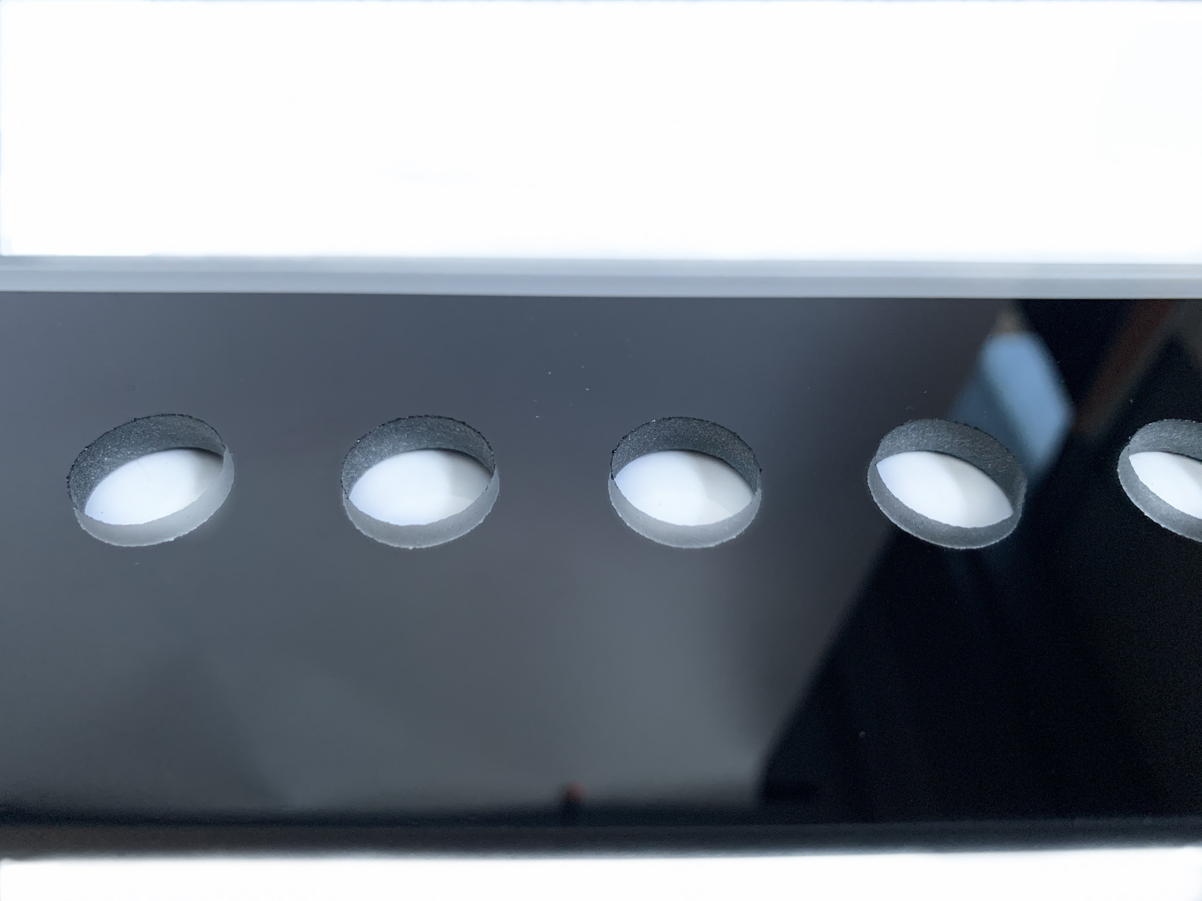 該款油煙機條狀玻璃為開孔式煙機面板玻璃,適用于帶按扭鍵的油煙機控制面板使用。在面板尺寸窄小,開孔尺寸偏小以及開孔個數(shù)偏多的條件下,使用數(shù)控設備為其精準打孔和磨邊。