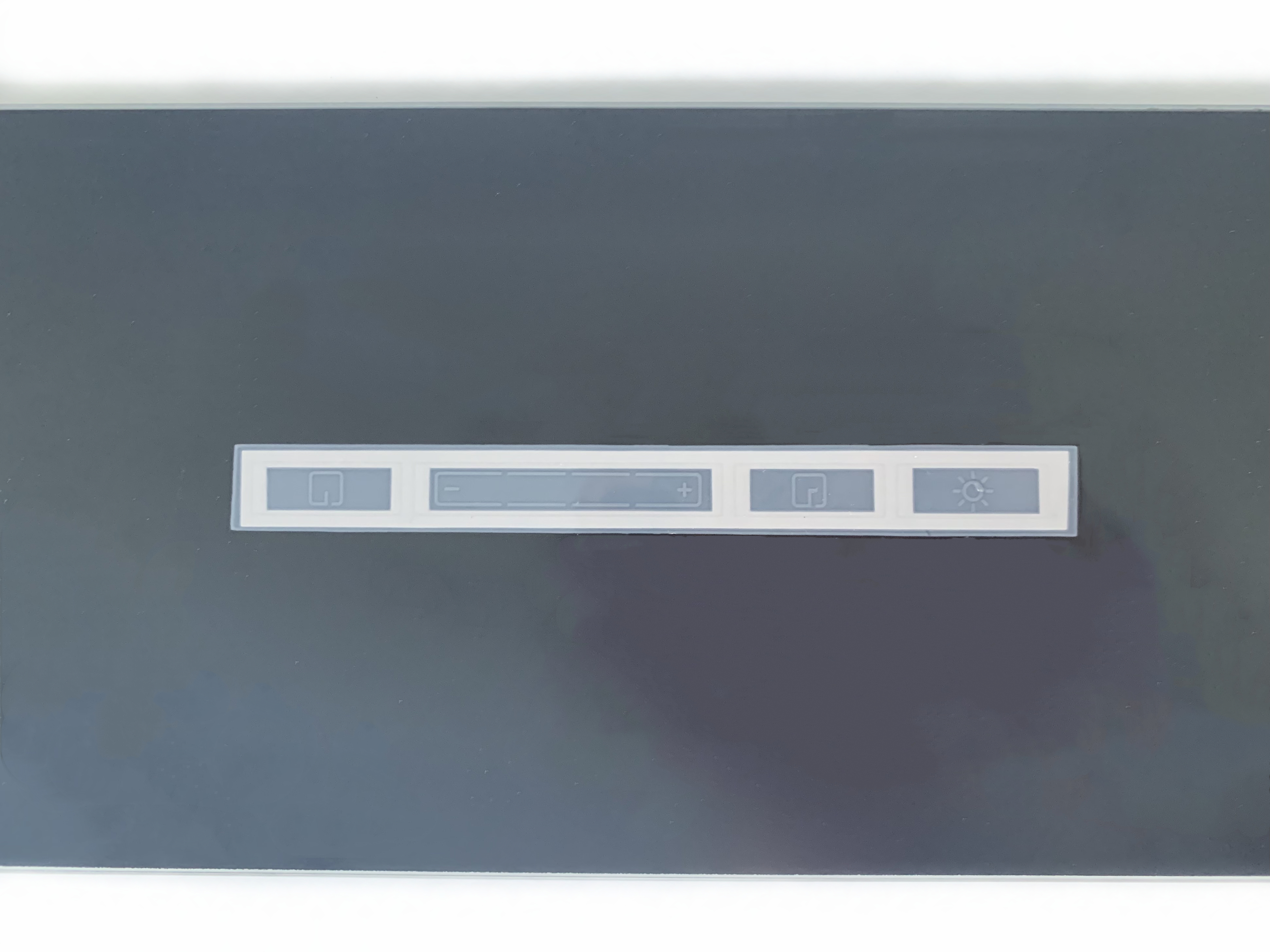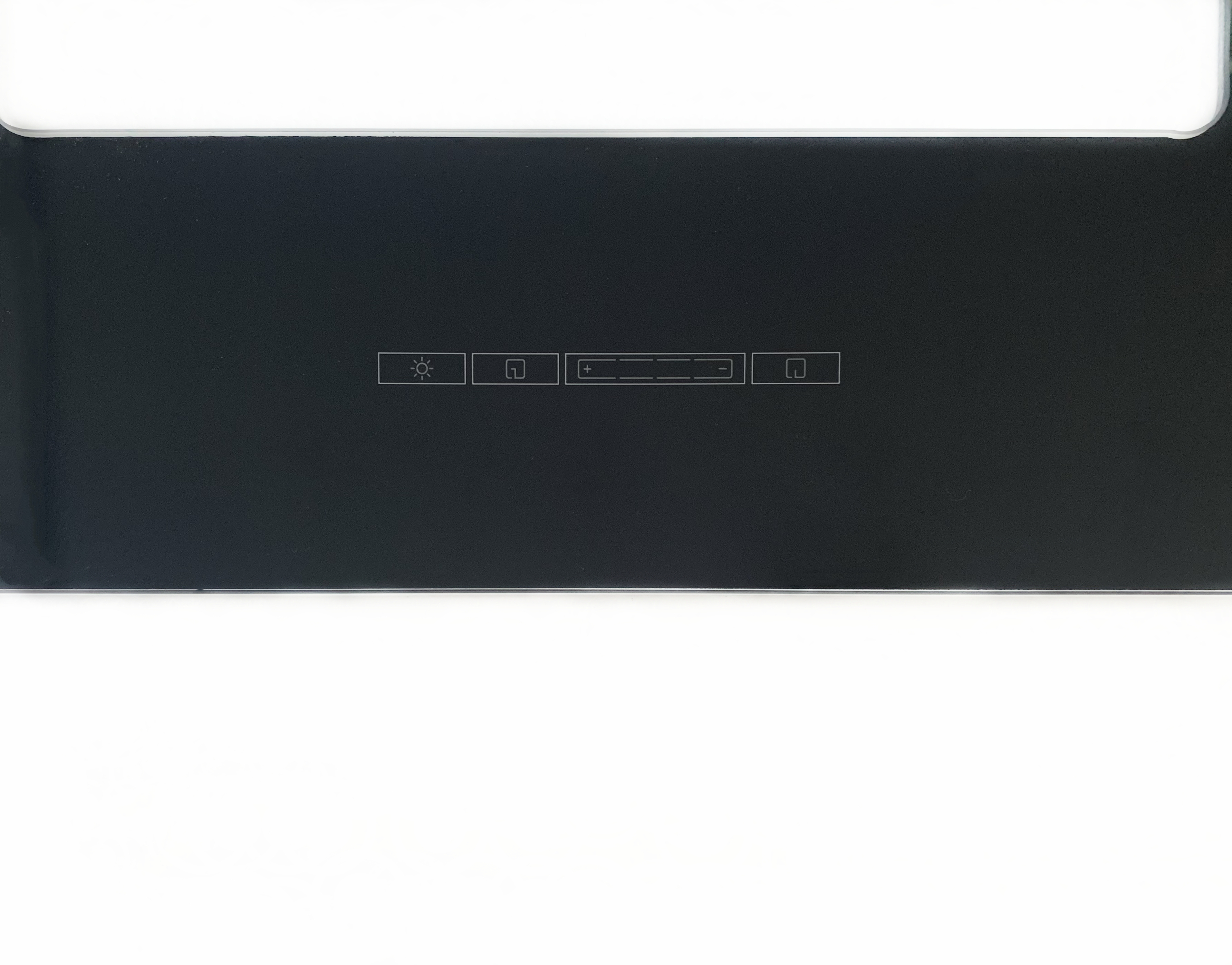 產(chǎn)品用于智能側(cè)吸油煙機上,油煙機面板,產(chǎn)品采用高精度切割技術和精致磨邊技術外形加工,印刷涂層以黑色為主,白色字符,感應開關符號采用銀白色半透明印刷,起到指示燈亮字符顏色與字符顏色一致的效果,印刷顏色與主機和諧結(jié)合。